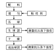 将原料按配比称量后倒入料斗,由料斗下部的卸灰阀均匀地放给刮板运输机,刮板运输机输送人混碾机,通过混碾机内碾轮和刮板将原料充分碾压和混合均匀。混碾的同时按比例加人纸浆废液,经过5min左右混碾后将物料放人混碾机下方的缓冲料仓,再放入斗式提升机,提升机将物料提升倒入压球机料斗,料斗内的预压螺旋向压球对辊作填鸭式强行给料,由于对辊强力的挤压作用使物料在对辊的球窝内成型,随着对辊的转动自动脱离掉在下方的皮带上,皮带输送给振动筛,筛上的生球由皮带运输机送人链带式干燥窑,筛下的碎料返回压球机料斗,干燥温度为200℃,干燥时间可视需要在2一4h之间调整,干燥后的成品球由皮带运输机送入成品仓。如下图: